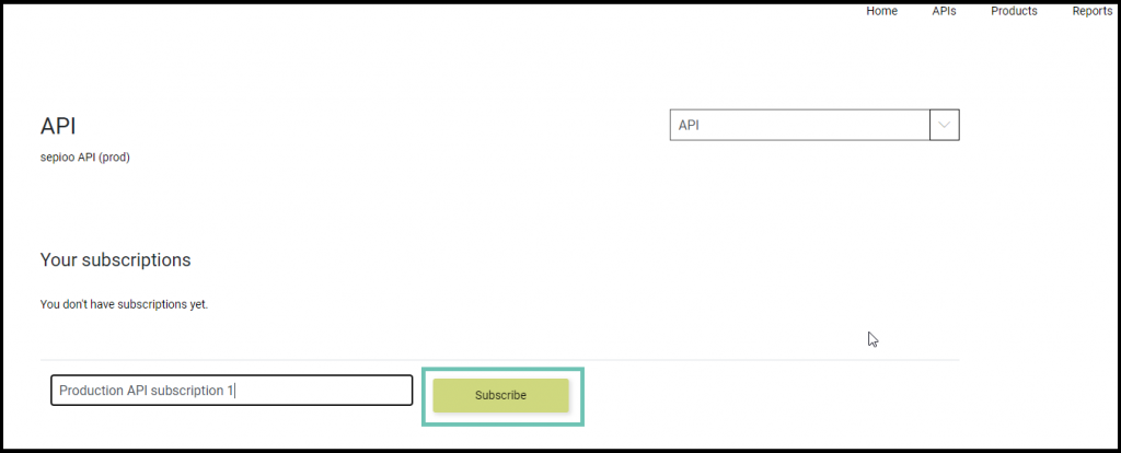 The first thing you need to do is subscribe to a product. This option is available by clicking on “PRODUCTS” and selecting the environment for which API keys are required. This will open another window where the subscription can be named and submitted by clicking “Subscribe” button.
