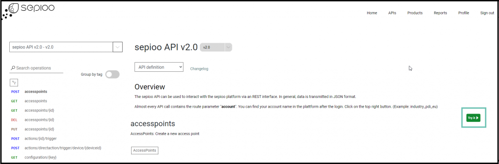 APIs are crucial part of any IoT system, and sepioo® is not an exception. sepioo® uses REST APIs to operate the platform. PDi Digital provides easy access and management of publicly available APIs related to sepioo. sepioo® Cloud and sepioo® On-Premise require a different approach to access the available API calls.