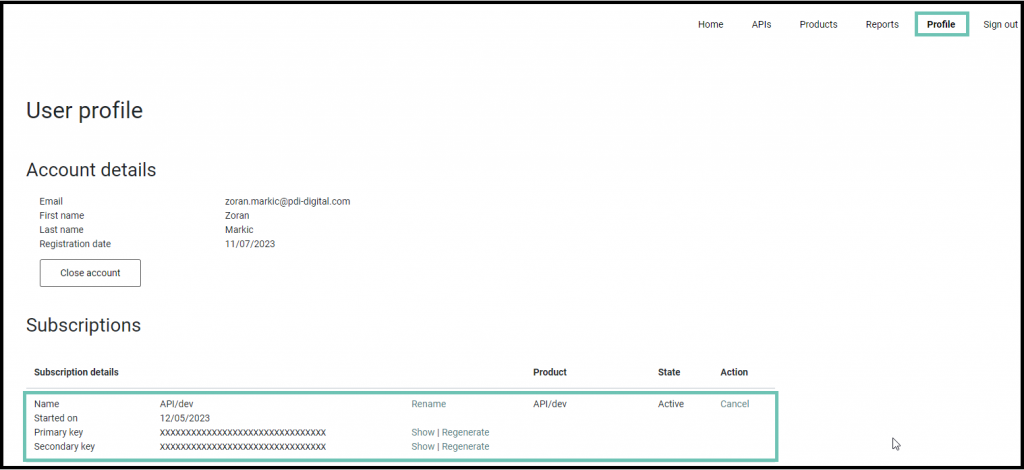 From this dashboard, you can copy and paste keys where needed, manage subscriptions, and even close accounts.