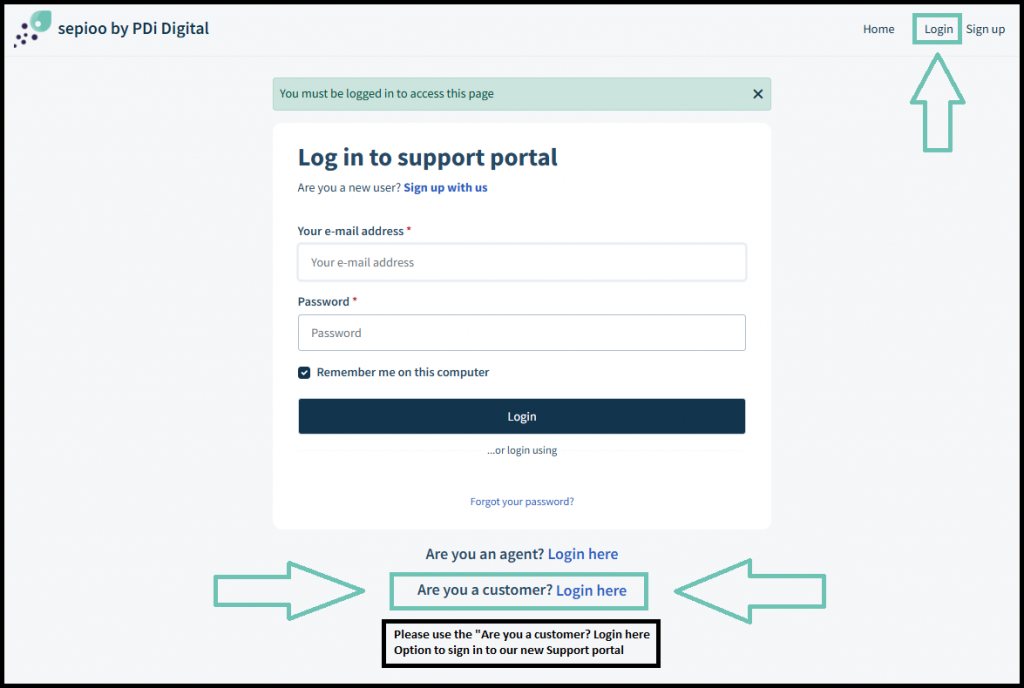 Once you are redirected to our new Support Portal, please log in using the “Are you a customer? Login here” option.